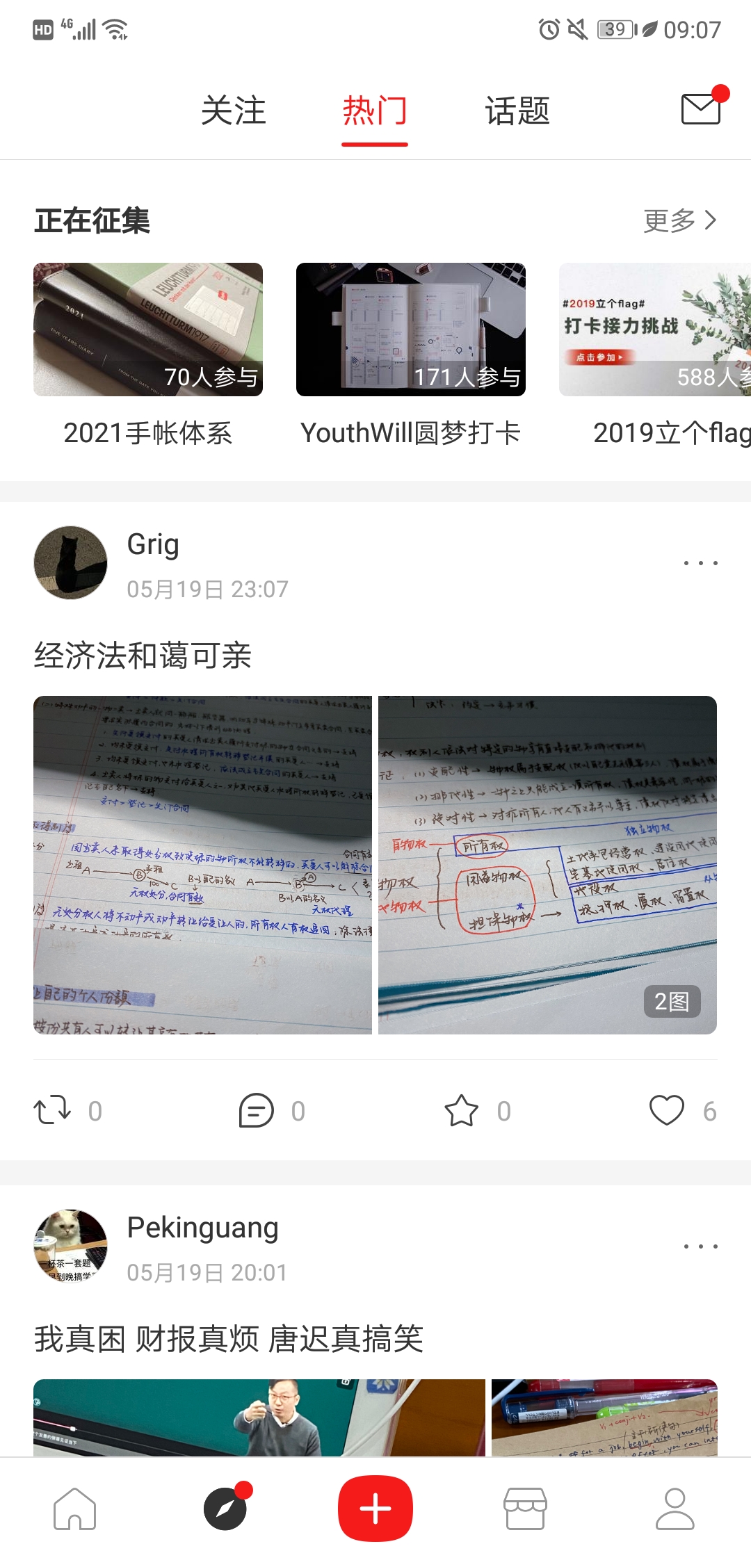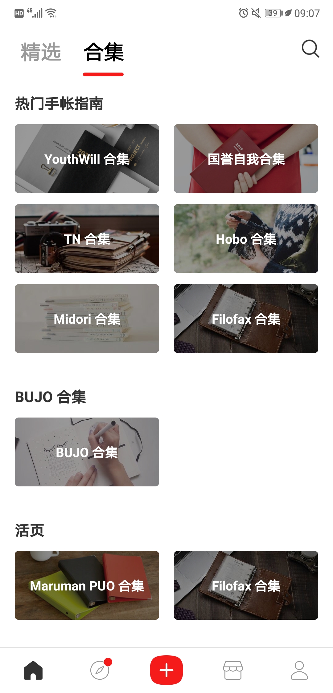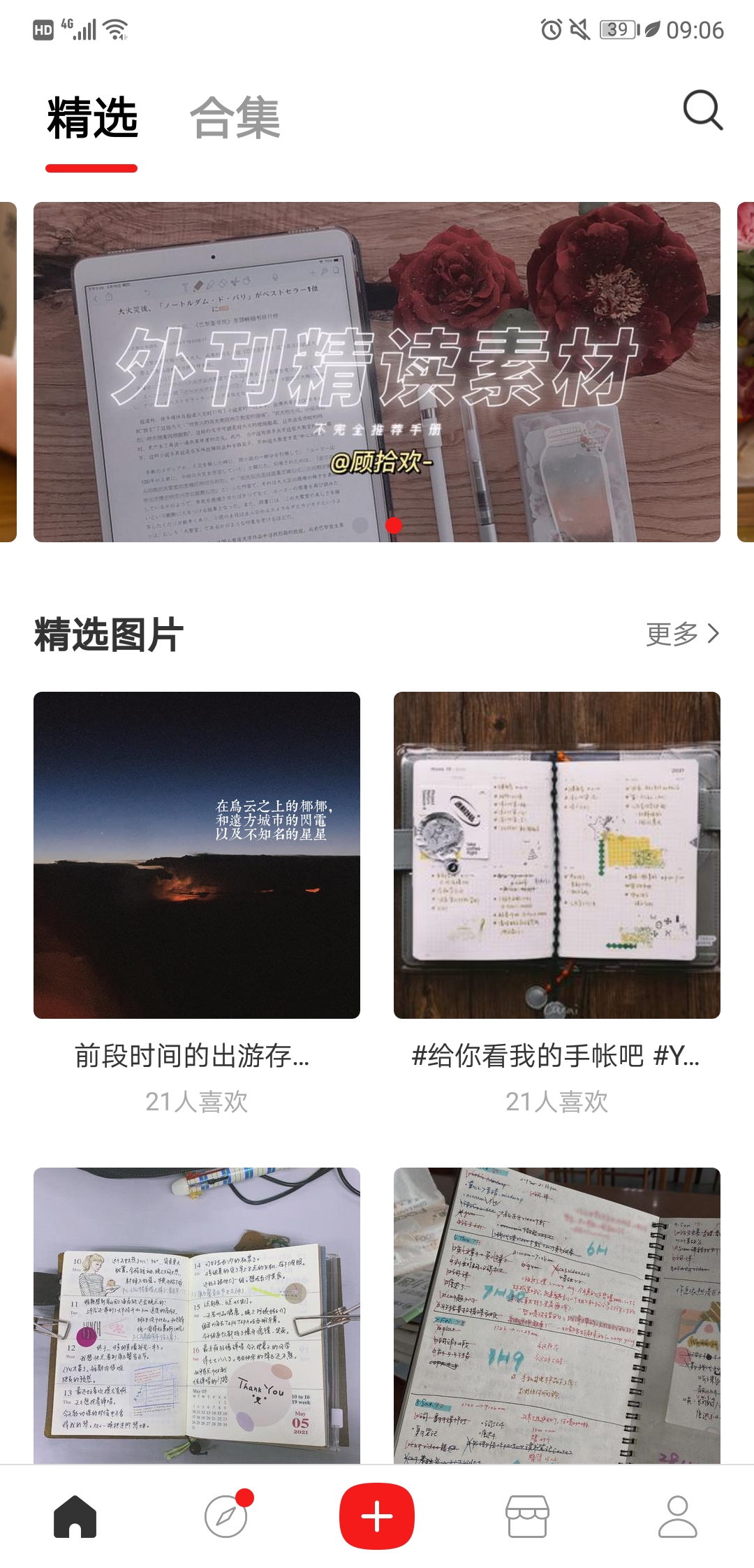 Paperi 首页下设精选与合集两个板块,展示社区用户发布的精选内容,主题涵盖手账制作、读书分享、备考指南、外语学习及App推荐等。